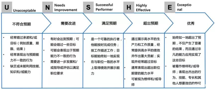 §不满足预期(Does Not Meet Expectations),是指职员可能已经达到了一些绩效目标,但总体上未能达到绩效要求和行为预期,需要立即采取行动来提升绩效。