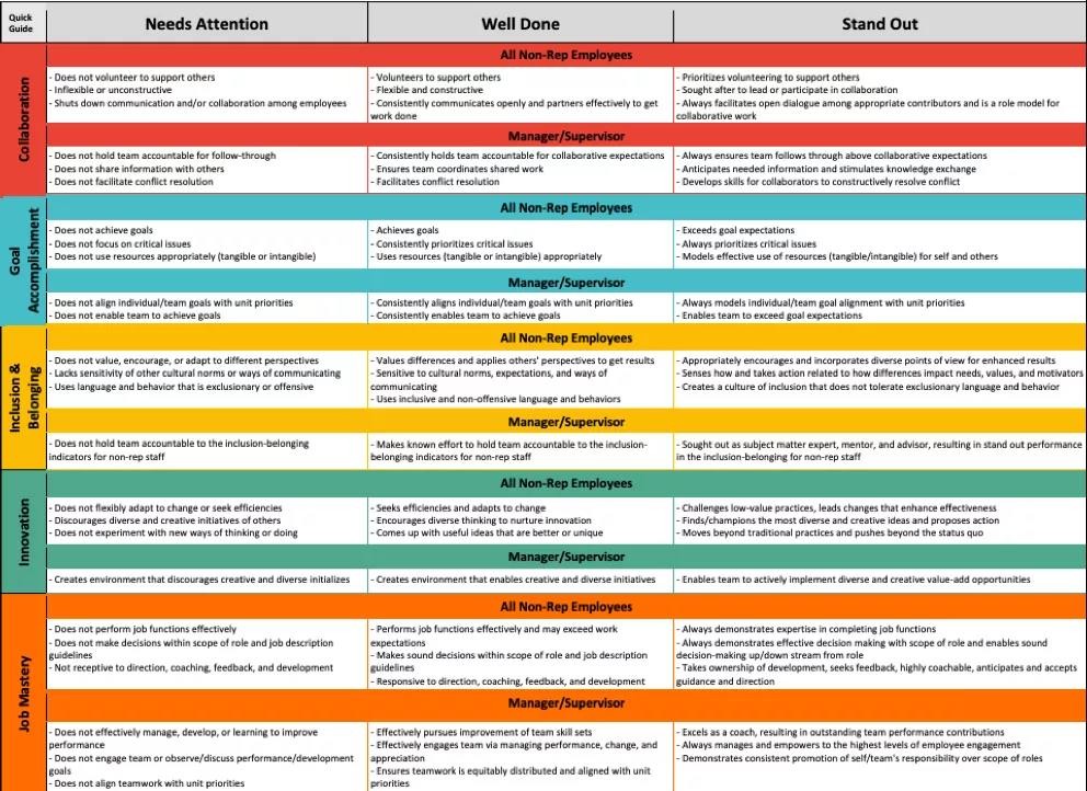 伯克利为职员的每个考核指标定义了不同等级的行为标准,如下图所示,总体分为“需要注意”(NeedsAttention)、“做得好”(Well Done)和“优秀”(StandOut)。