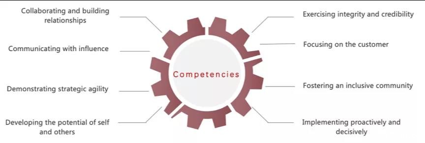 “合作并建立联系”(Collaborating and building relationships)、“有影响力的沟通”(Communicatingwith influence)、“展示战略的灵活性”(Demonstrating strategic agility)、“发展自我和他人的潜能”(Developingthe potential of self and others)、保持诚信(Exercisingintegrity and credibility)、“关注客户”(Focusingon the customer)、“培育包容性社区”(Fostering an inclusive community)和“积极果断地执行”(Implementingproactively and decisively)。