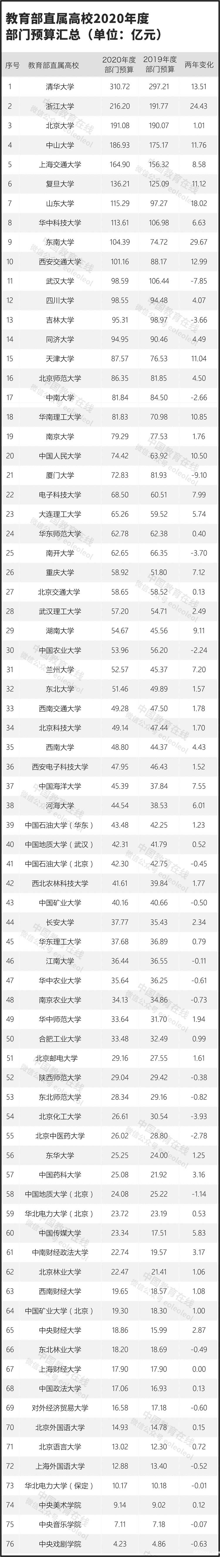 2020年6月11日,教育部率先在其官网公布了其2020年度经费预算。根据教育部《关于部属高校公开部门预算的通知》要求,教育部直属高校均应在一定期间内公布其经费预算,以回应社会关切。根据教育部直属高校公布的预算经费,我们可以对76所高校“国家队”的经费数量和使用情况有一定了解。