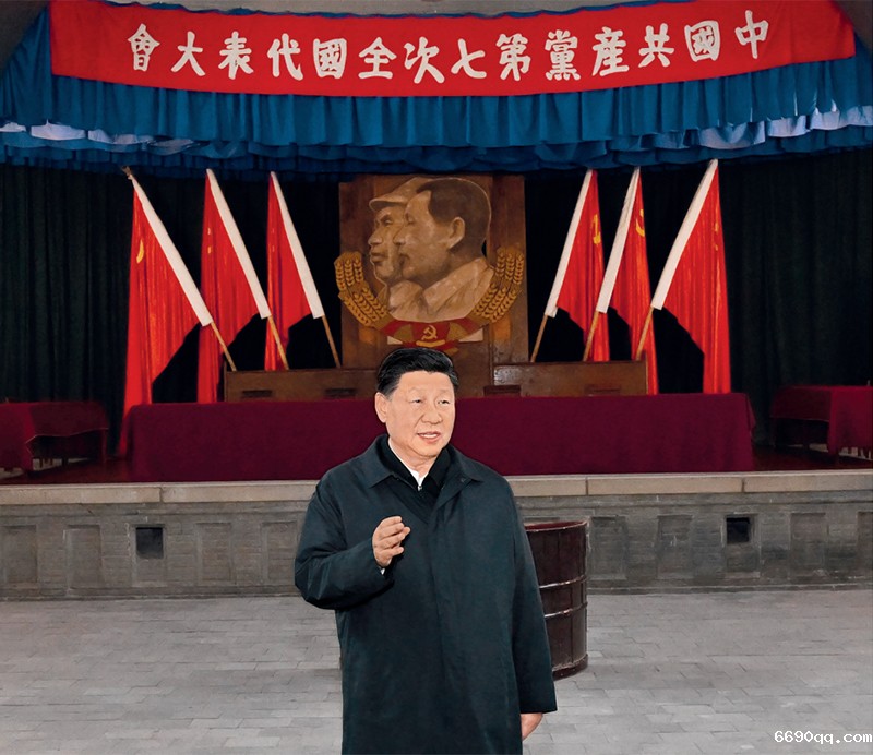 2022年10月27日,中共中央总书记、国家主席、中央军委主席习近平带领中共中央政治局常委李强、赵乐际、王沪宁、蔡奇、丁薛祥、李希,瞻仰延安革命纪念地。这是习近平在杨家岭瞻仰中共七大会址。